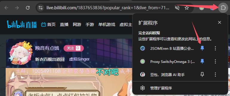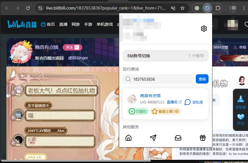 在直播间或个人主页直接左键单击扩展图标即可弹出用户状态。