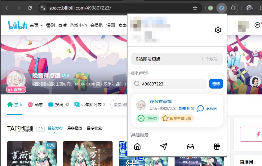 左键单击扩展图标后可以查看到「B站账号切换」,点击添加账号即可新增一个账号,之后选择任意账号会自动切换到选择的账号。